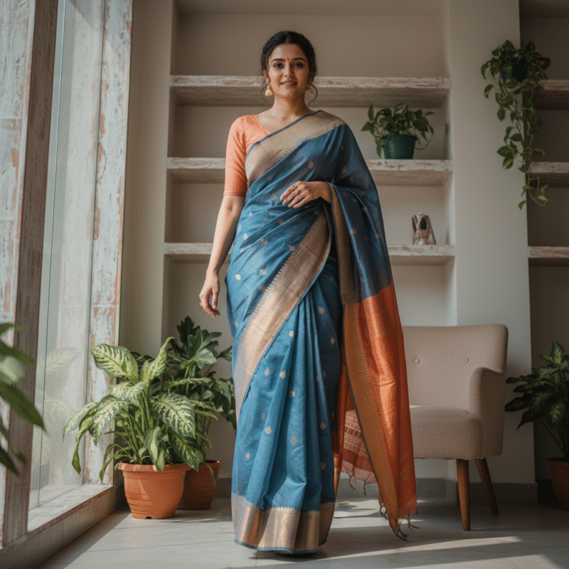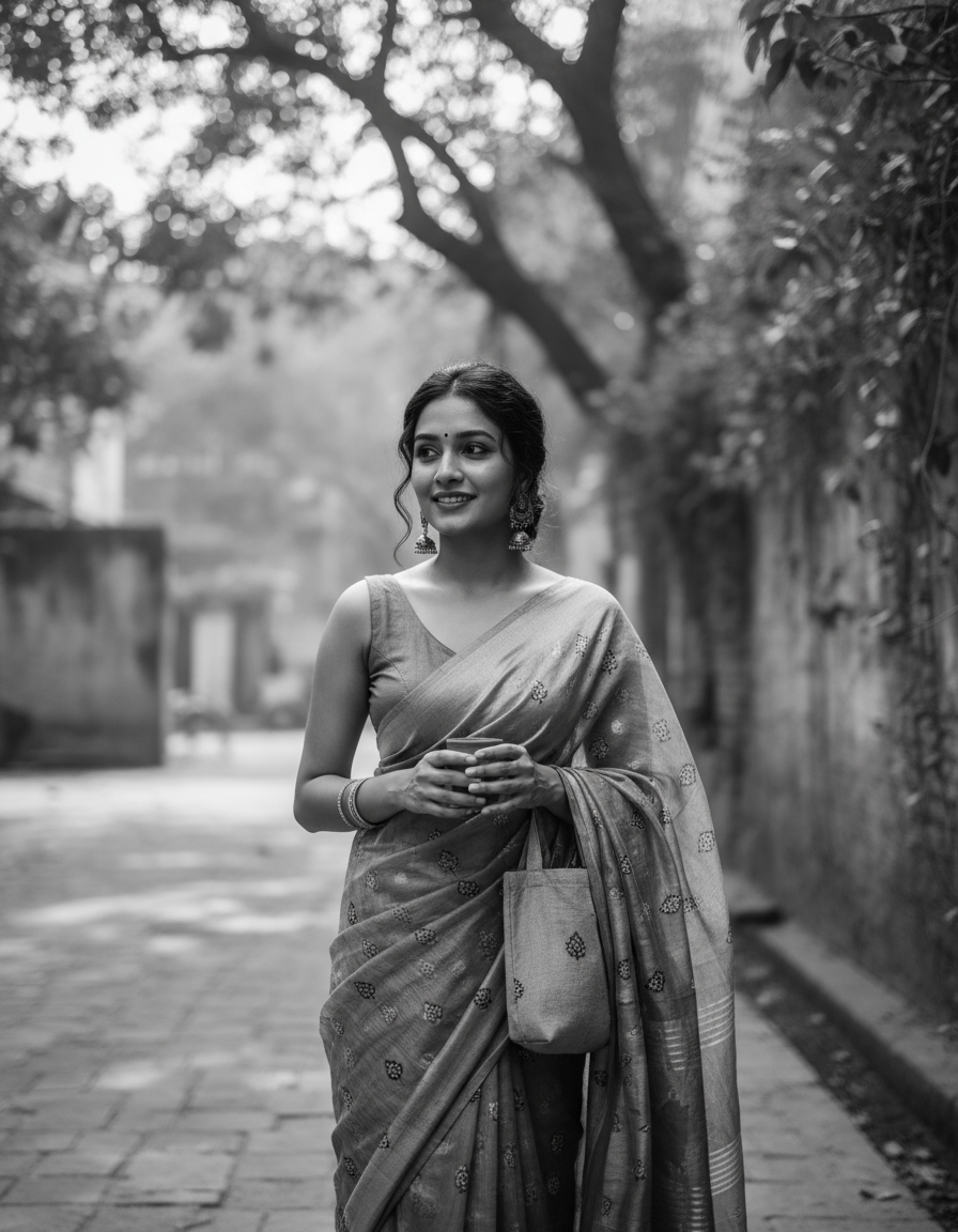 From Ajrakh and Bagru prints to delicate embroidered details, every saree is crafted to tell a story one that celebrates individuality, comfort and timeless beauty.