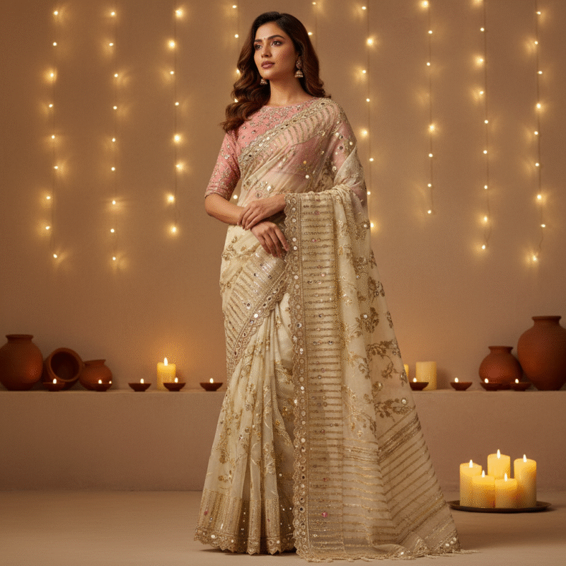 Inspired by India’s timeless traditions Ajrakh, Bagru and Sanganeri prints each drape blends natural dyes, fine embroidery and mirror work into a story of heritage and artistry.